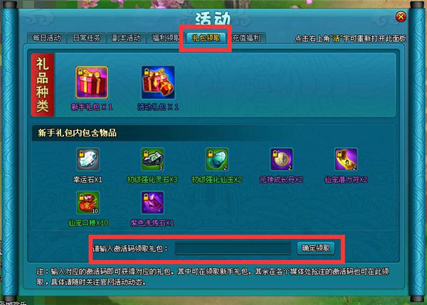 3、在活动页面上方点击“礼包领取”,并在下方输入框中输入卡号,点击“确定领取”。