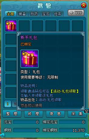 5、新手礼包内容:修为丹*1;气血包*1;法力包*1;仙宠口粮*5;蓝色洗练石*3;元神成长丹*2;仙宠潜力符*2;初级强化仙玉*2;初级强化灵石*5。