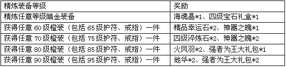 活动规则:活动期间,玩家通过橙装精炼获得任意一件橙装(包括橙色武器)或精炼成功任意暗金装备,即可获得系统奖励一份。