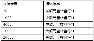 活动期间,玩家充值至指定额度,即可获得对应的元宝转盘符,使用元宝转盘符转动转盘,将可随机获得转盘上任意额度的元宝奖励。每个额度转盘只能转一次,每一轮转完之后将开启下一轮转盘。元宝转盘升级后,最高可累计获得30520非绑定元宝返利哦!