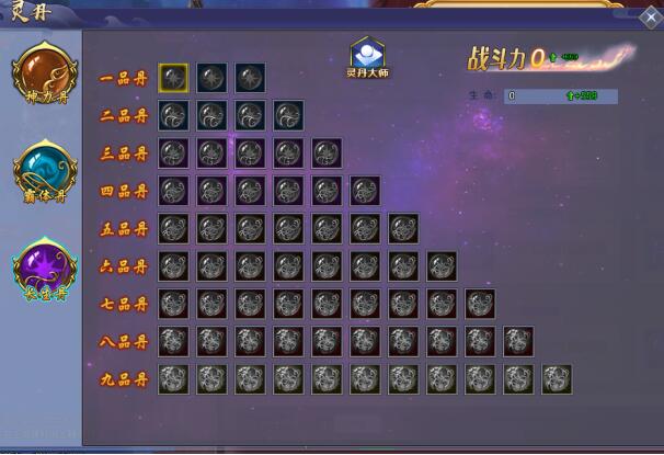 灵丹分为三个品种,每个品种分九品。分别为“神力丹”“霸体丹”“长生丹”;分别对应提升角色的战力、攻击、生命、攻击、及防御属性加成。