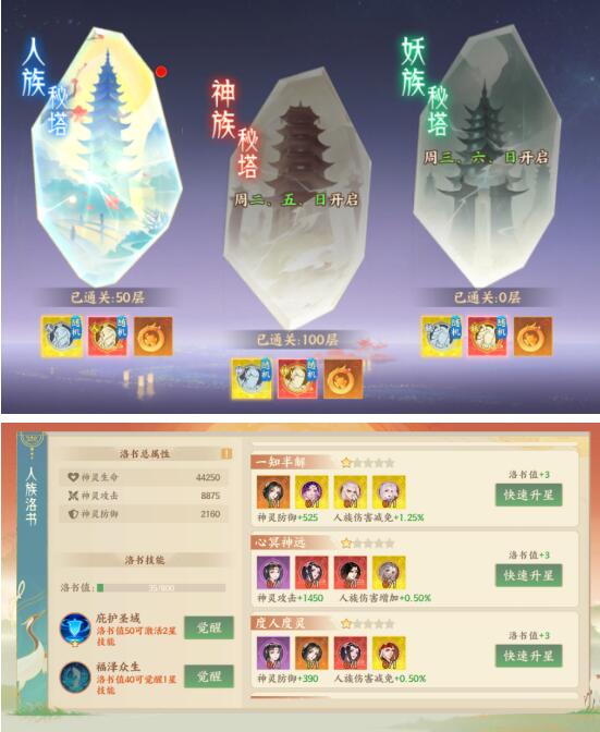 种族塔分为【人族】【神族】【妖族】三个类型的关卡,每周根据日期开启