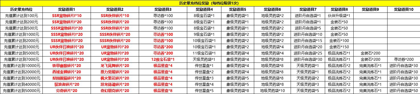 活动规则:从创角时开始计算,总累充返利每个档次奖励终身仅可领取1次