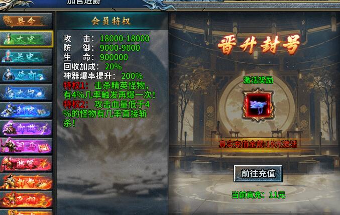 从县令到皇帝,通过游戏内免费赠送的真充卡即可激活对应的官位特权,获得丰厚奖励与属性加成!