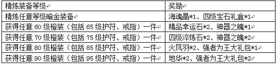 活动规则:活动期间,玩家通过橙装精炼获得任意一件橙装(包括橙色武器)或精炼成功任意暗金装备,即可获得系统奖励一份。