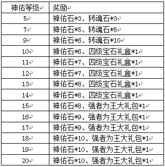 活动规则:活动期间,将任意装备神佑提升到指定等级,可获得额外系统赠礼。