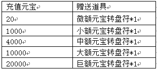 活动期间,玩家充值至指定额度,即可获得对应的元宝转盘符,使用元宝转盘符转动转盘,将可随机获得转盘上任意额度的元宝奖励。每个额度转盘只能转一次,每一轮转完之后将开启下一轮转盘。元宝转盘升级后,最高可累计获得30520非绑定元宝返利哦!