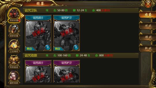 1、图鉴分为:混世妖魔、绝世妖魔、上古神兵、传世套装、盛世美颜。