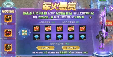 通过击杀怪物数量获得寻宝机会,每次抽奖可随机获得对应数量的钻石或者充值卡。
