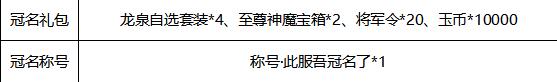 1、玩家所在区服开服首位累充达到2000元的玩家即可申请冠名,并且是该服务器第一个申请冠名奖励的玩家可获得区服冠名特权,并获得一份 冠名礼包+冠名称号 奖励